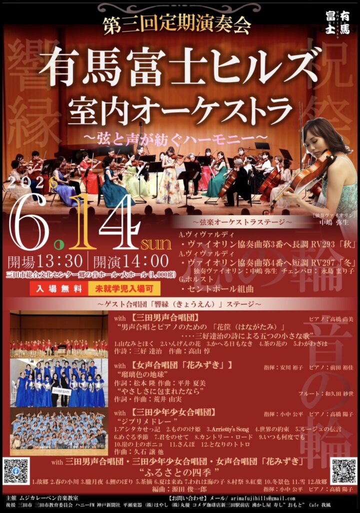 今回は、三田市内で活動されています合唱団とコラボレーションし、地域の皆さまと音楽でつながる演奏会となっております。共…