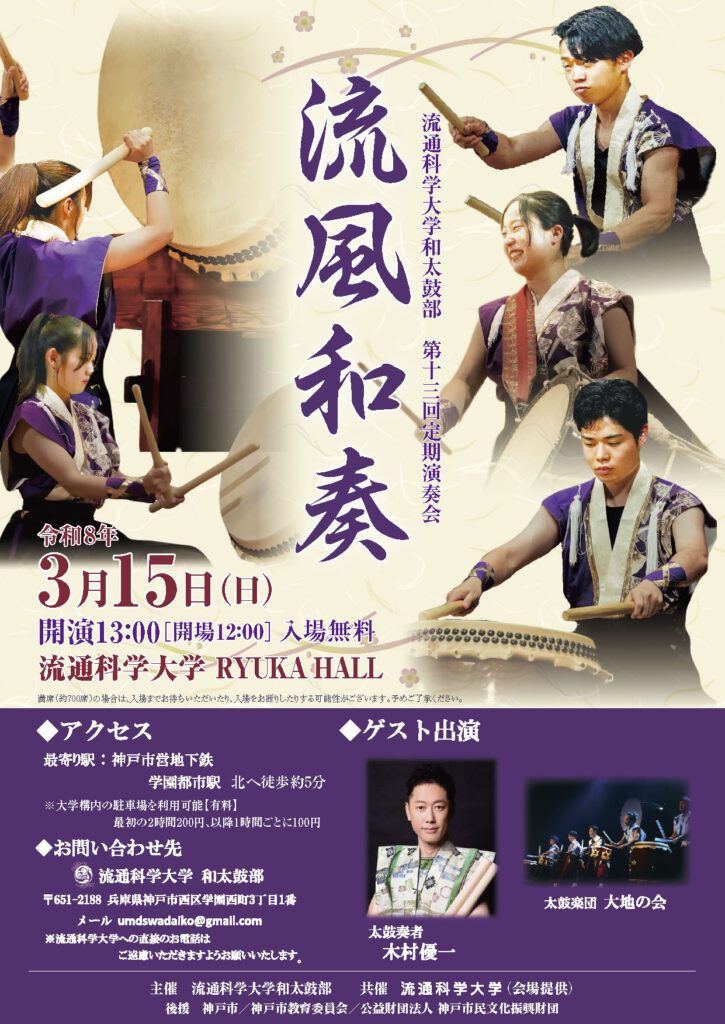 ゲストには、創部当時から私たちの指導をしていただいている、プロの和太鼓奏者 木村優一先生をはじめ、太鼓楽団 大地の会を…