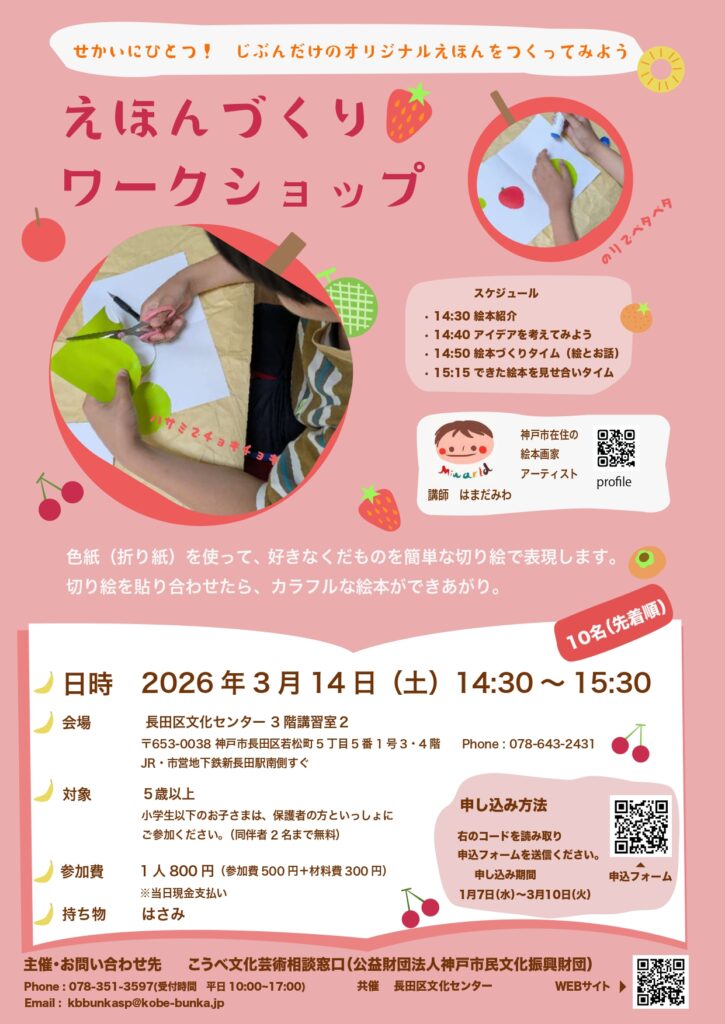 神戸市在住の絵本作家を迎え、“果物”をテーマにした簡単な切り絵の絵本づくりに挑戦します。世界にひとつだけのオリジナル絵…
