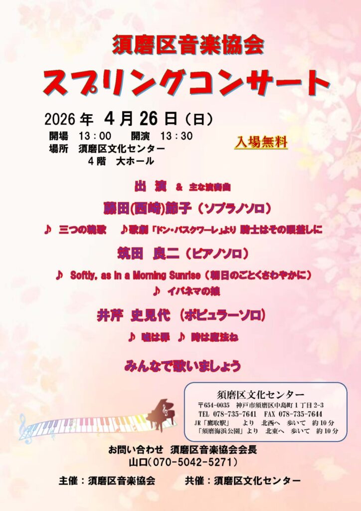 毎年恒例のコンサートです。須磨区音楽協会に所属しているアーティストの方々が演奏を披露してくれます。入場無料で予約も不…