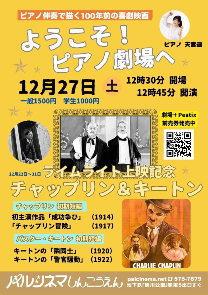 映画「チャップリン」公開記念パルシネマでは12月22日より「ライムライト」上演天宮遥さんを伴奏に迎えたパルシネマ無声映画…