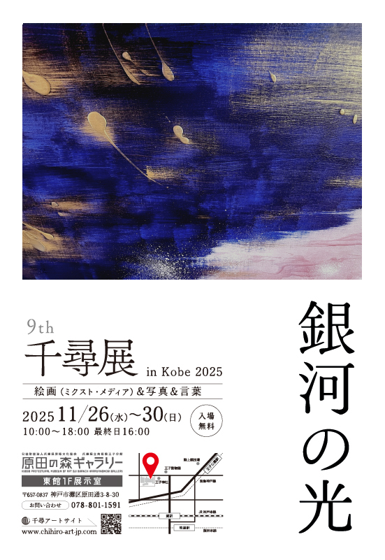 内容 | テーマ 銀河の光絵画(ミクスト・メディア) & 写真 & 言葉この広い空間で言葉から共鳴する絵画と写真を展示しています。9回目の個展開催となります。ぜひご高覧ください。 |