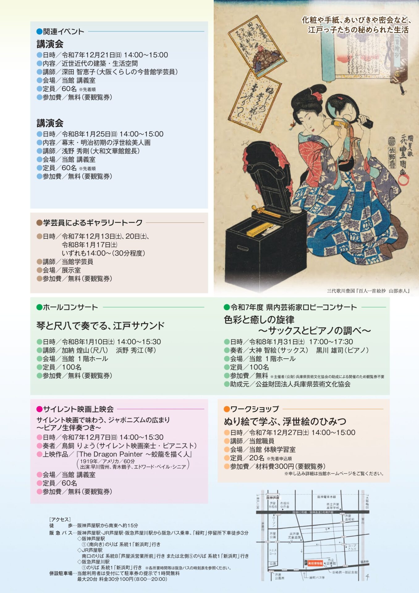| 催し物名 | 徹底解剖!浮世絵で見る江戸のライフスタイル―国貞・英泉・芳年の描いた「粋な」女たち |