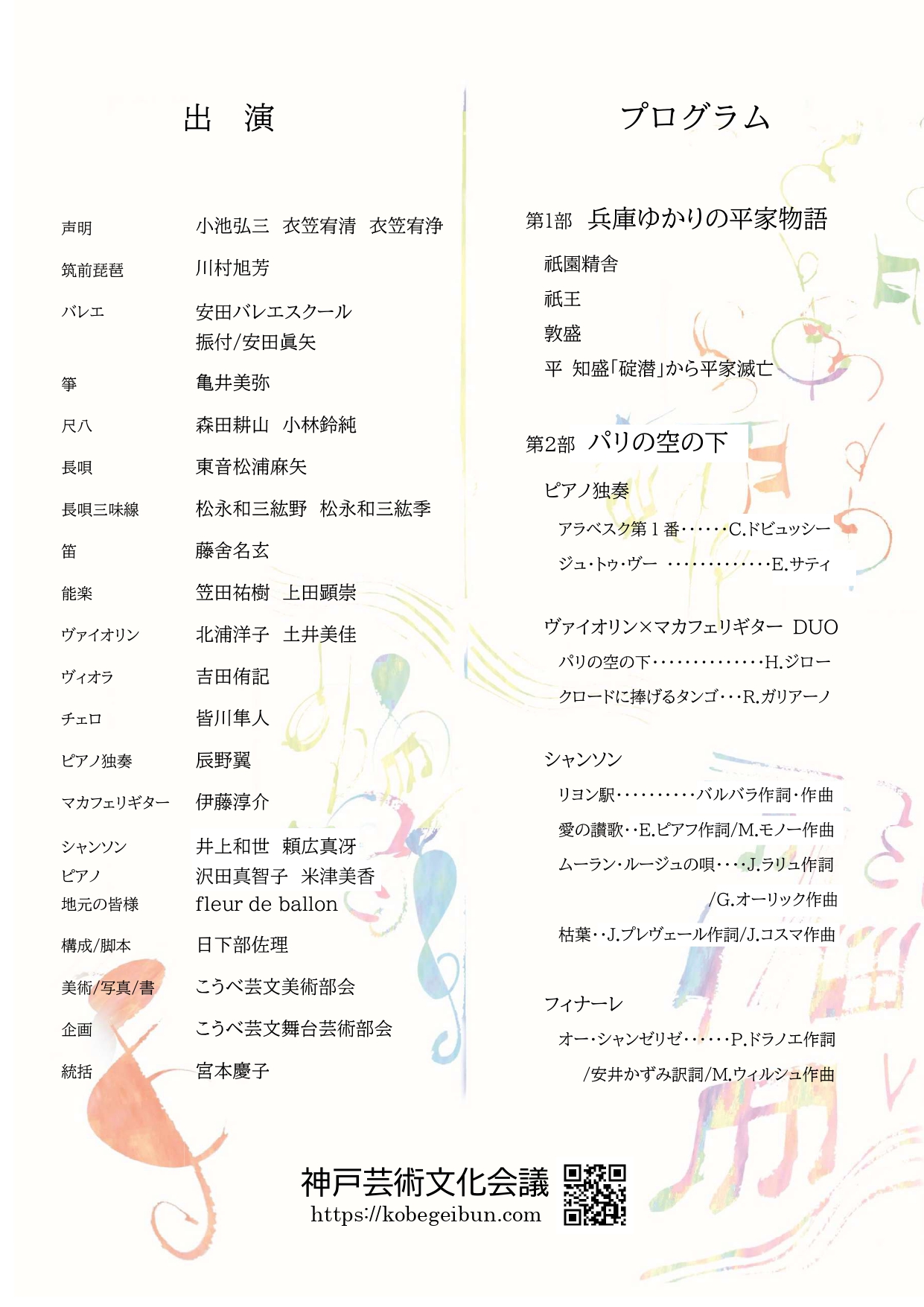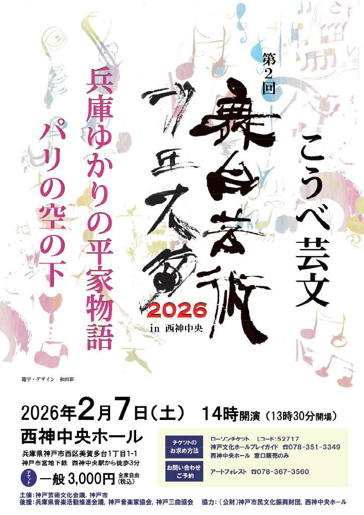 | 内容 | 神戸芸術文化会議の会員を中心に、音楽・舞踊をはじめ多彩なジャンルの出演者が集結する特別ステージです。第1部兵庫ゆかりの平家物語、第2部パリの空の下と題しまして、ジャンルの垣根を越えた創造的なパフォーマンスをお届けします。 |