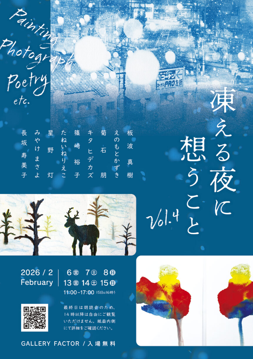 | 内容 | GALLERY FACTOR 恒例!冬のジャンルレス展覧会です。9名の作家による詩・絵画・写真・立体作品の展示はもちろん、ワークショップや朗読会も実施いたします。詳細はWebサイトにてご確認ください。 |