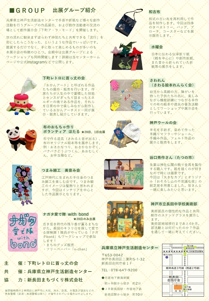 内容世の流れに馴染まず逆らわず仲間たちと共有できる「流行」を 形にしたらこうなった、というような作品でいっぱいです。 会期中は出展グループによる ワークショップも同時開催します。