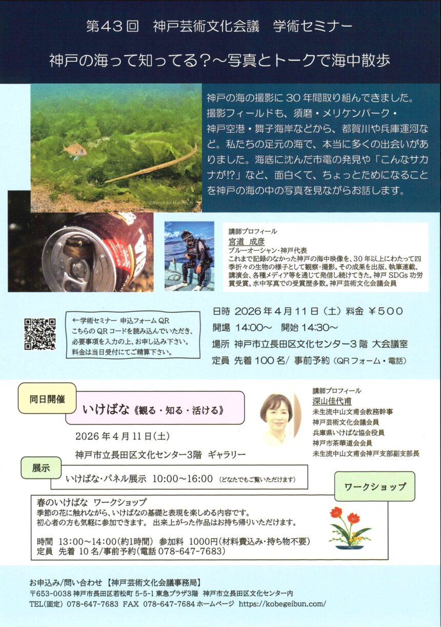 | 内容 | 海中写真家による迫力の写真と、現地でのエピソードを交えたトークで神戸の海を海中散歩。人と自然、歴史を感じるひととき。同日、ギャラリーにていけばなの展示、ワークショップも開催。あわせてお楽しみください。 |