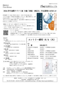 内容2026 伊丹国際クラフト展 主題『酒器・酒盃台』作品募集のお知らせ詳しくはウェブサイト(https://itami-im.jp/craftexhibition/)ご覧ください入選作品展は2026年11月14日(土)~12月20日(日)
