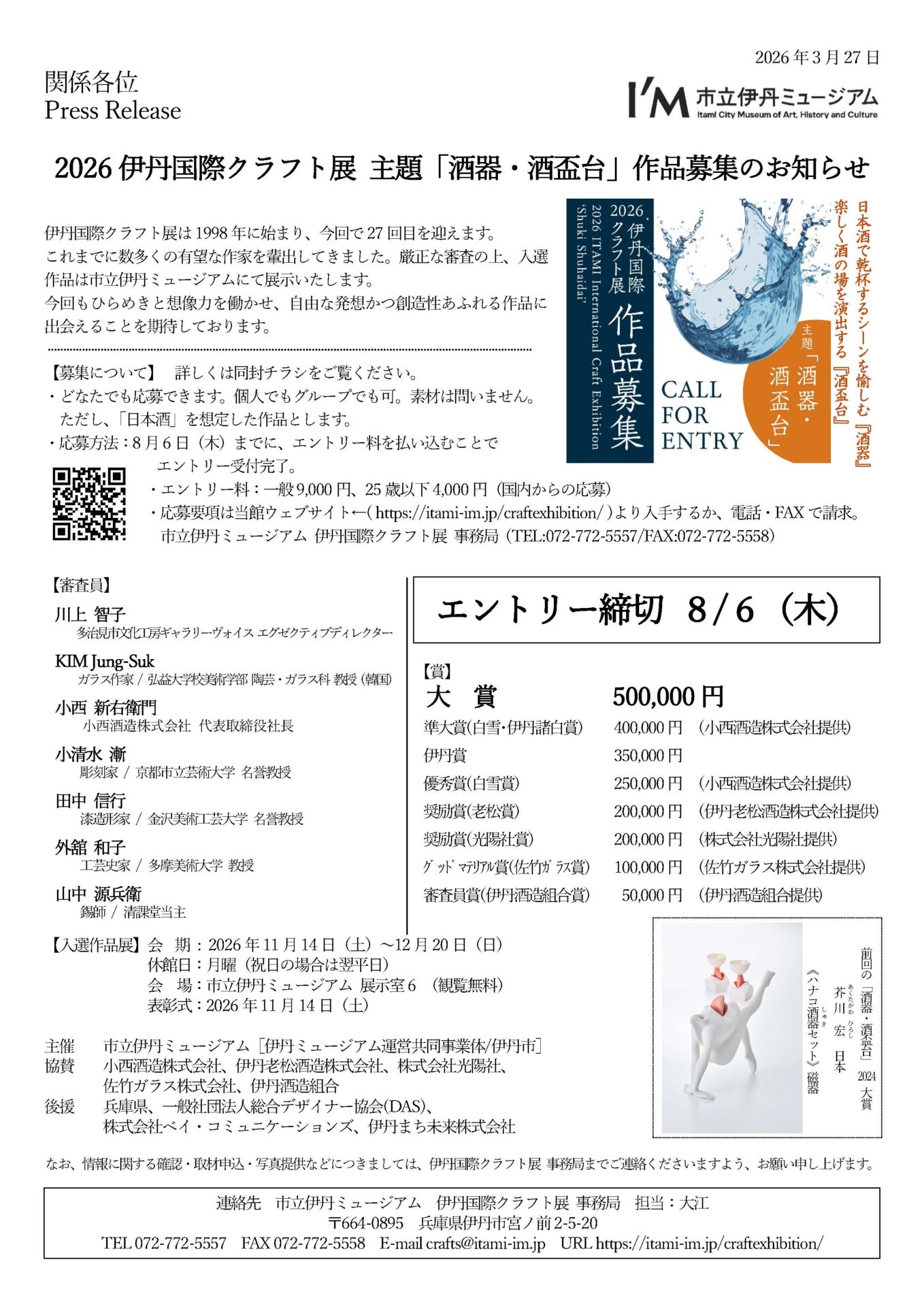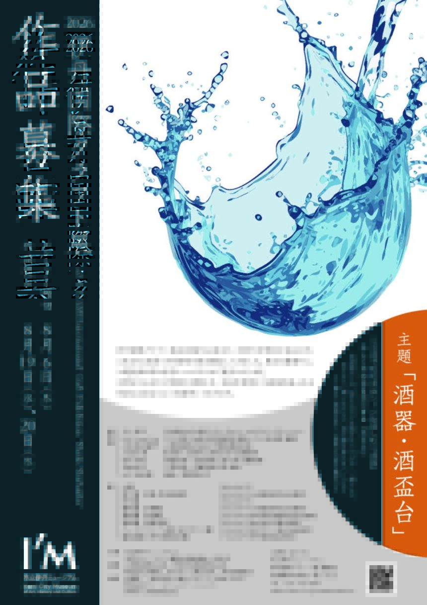 内容2026 伊丹国際クラフト展 主題『酒器・酒盃台』作品募集のお知らせ詳しくはウェブサイト(https://itami-im.jp/craftexhibition/)ご覧ください入選作品展は2026年11月14日(土)~12月20日(日)