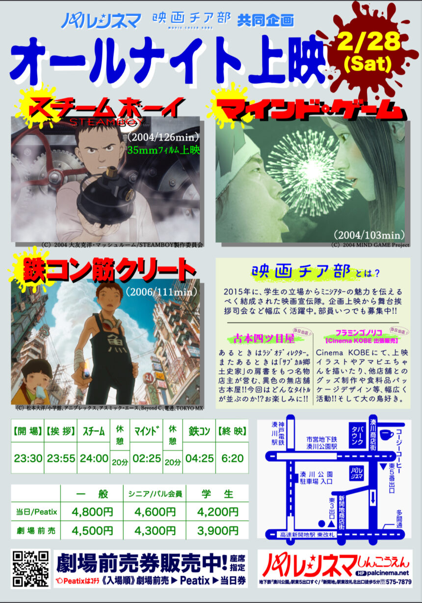 内容『スチームボーイ』『鉄コン筋クリート』『マインド・ゲーム』珠玉の3作品一挙上映!近年アニメ映画が注目を集めている今だからこそ、現在につながる表現や挑戦が詰まったこれらの作品をぜひ改めて大きなスクリーンでご覧ください!