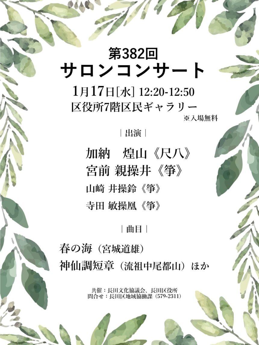 | 内容 | 長田区役所で毎月行われている無料のコンサートです。どなたでもお気軽にお越しください。出演:加納煌山(尺八)、宮前親操井、山崎井操鈴、寺田敏操凰(箏)曲目:春の海(宮城道雄)、神仙調短章(流祖中尾都山)ほか |