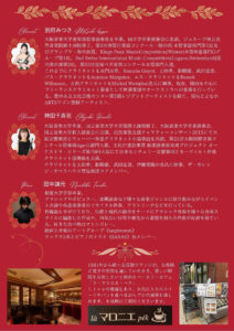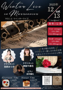内容 | クラリネットとピアノが紡ぐ冬の調べ。木のぬくもりを感じる音色で、心安らぐクリスマスのひとときを。マロニエで過ごす特別な音楽時間をお楽しみください。 |