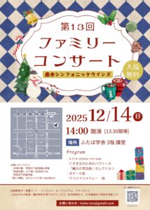 内容もと小学校の講堂でおこなわれるコンサート。レトロな雰囲気と共にお楽しみいただけます。マーチあり、クラシックあり、Swingあり、クリスマスメドレーあり🎁と盛りだくさんの内容でお届けします。