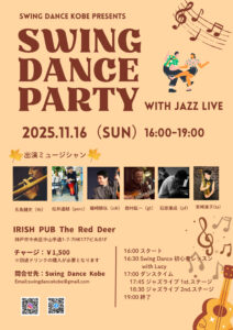 | 開催日時 | 2025年11月16日(日)16:00~19:00 Swing Dance初心者レッスン16:30-17:00 ジャズライブ 17:45-18:15、18:30-19:00 |