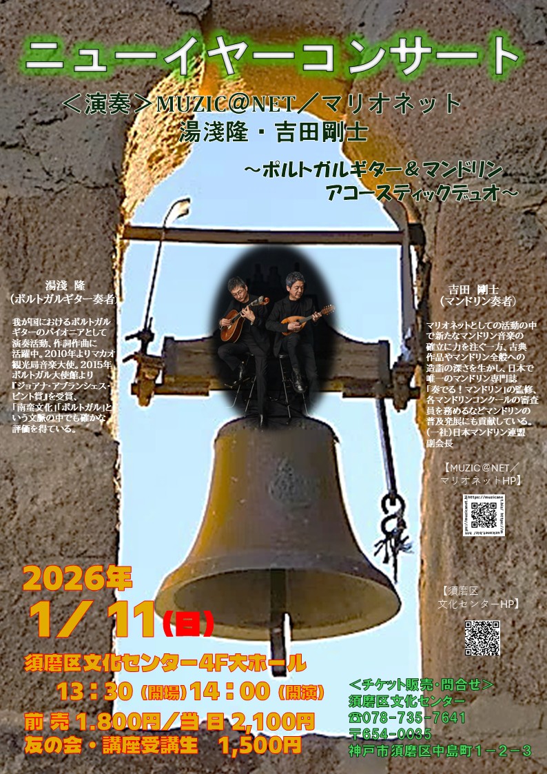 内容MUZIC@NET/マリオネットによる毎年恒例のニューイヤーコンサートです。ポルトガルギターとマンドリンによる異国情緒豊かな音色が響きわたります。聴いているとどこか懐かしい、癒しの音楽をぜひ聴きに来てください♪