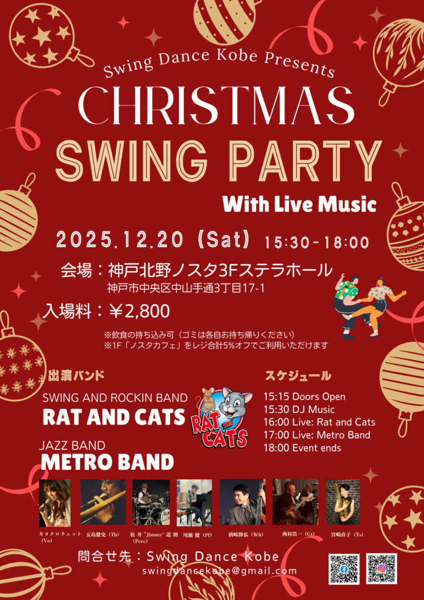 | 開催日時 | 日時:2025年12月20日(土)15:30~18:00 15:15 開場 15:30 DJ音楽 16:00-16:40 ライブ:RAT AND CATS(Swing and Rockin Band) 17:00-17:40 ライブ:METRO BAND(Jazz) 18:00 終了 |
