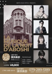 | 開催日時 | 2026年1月11日 17:30 入場開始 18:00 ディナー開始 19:00 ライブ開始 (20:40ごろ終演予定) |