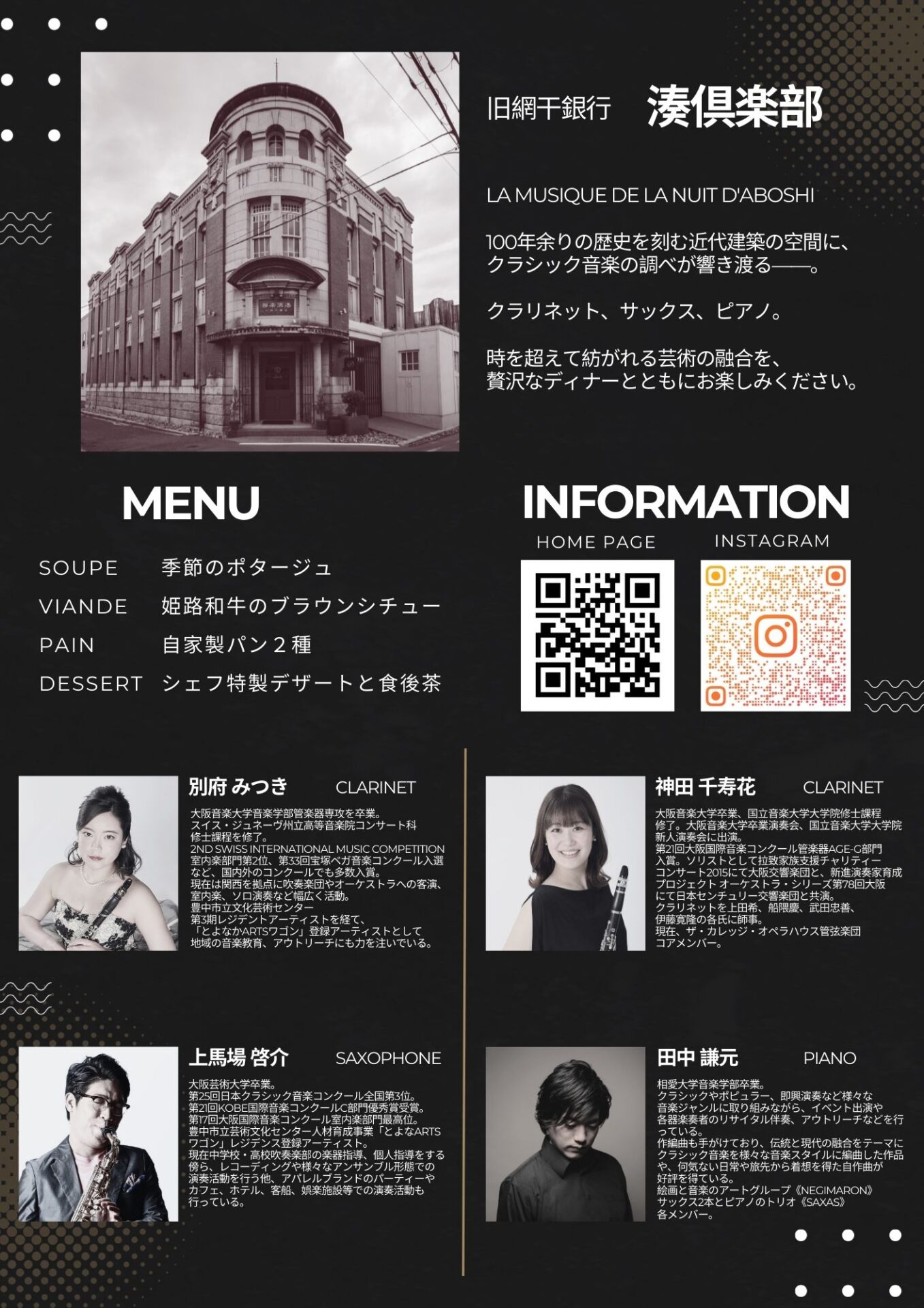 | 内容 | 100年余りの歴史を刻む近代建築の空間に、クラシック音楽の調べが響き渡る――。 クラリネット、サックス、ピアノ。時を超えて紡がれる芸術の融合を、贅沢なディナーとともにお楽しみください。 |