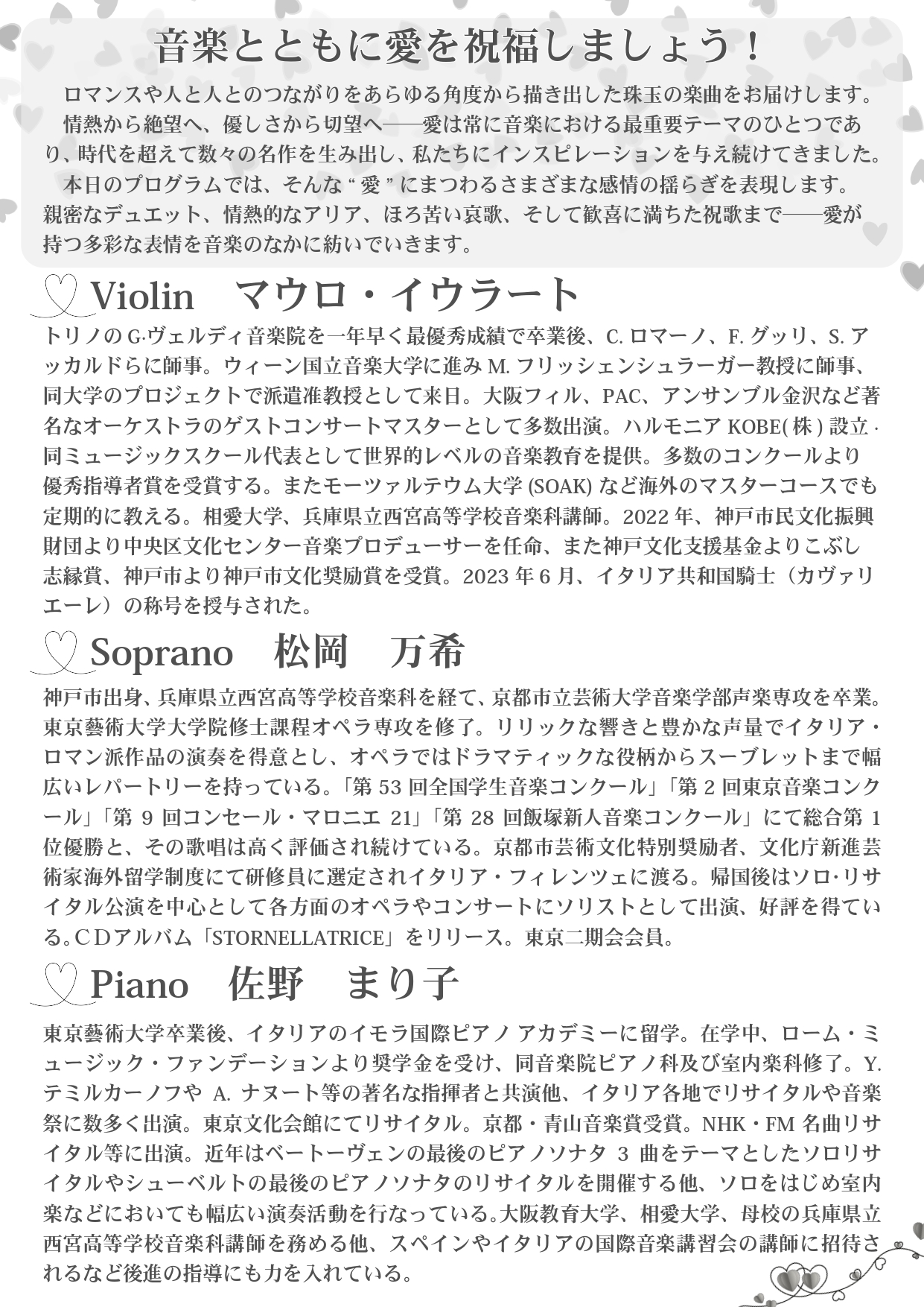 内容バレンタインデーにちなんで、「愛」がテーマの演奏会を開催いたします。愛がもつ多彩な表情を音楽になかに紡いでいきます。
