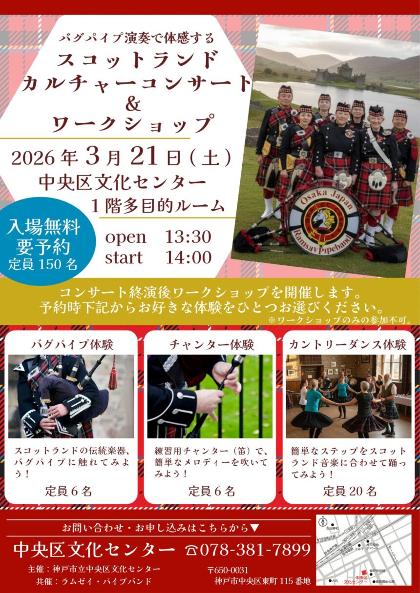 内容スコットランド文化を象徴する民族楽器「バグパイプ」のコンサートです。コンサート終了後、ワークショップも開催いたします。※要予約