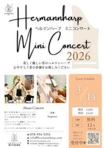 | 内容 | 神戸旧居留地で、ドイツの弦楽器「ヘルマンハープ」のミニコンサートを開催いたします。優しいハープの音色に耳を傾けながら、午後のひとときを。コンサートの後には、実際に触れていただける体験会もございます。参加費は無料で、ご予約が必要です。 |
