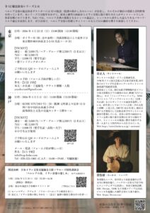 | 料金 | 前売:一般 3,000円/ペア・グループ割 2,500円(2名以上)、当日:一般 3,500円、学生:2,000円(要学生証:高校〜大学) ※中学生以下無料 |