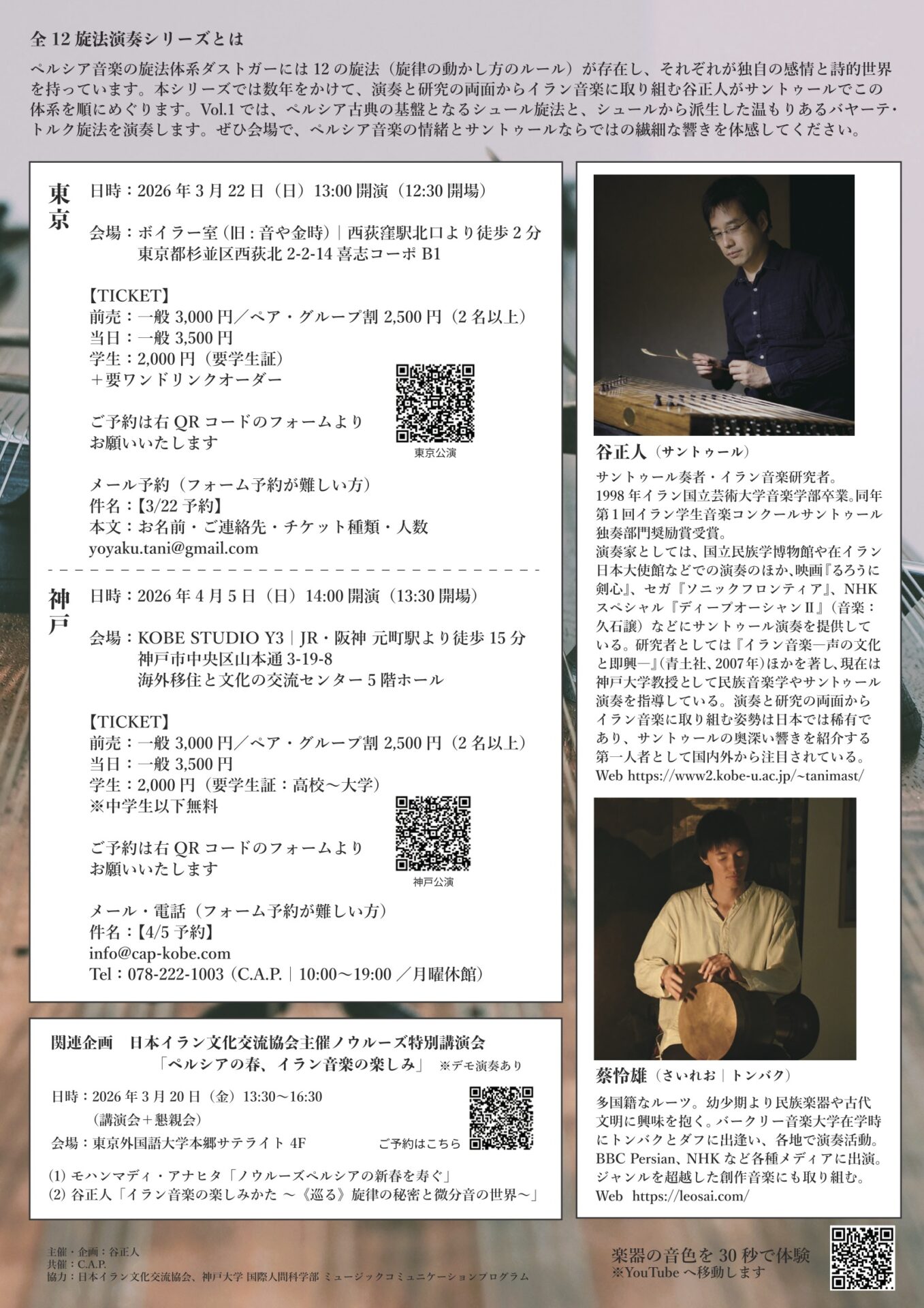 | 内容 | 出演:谷正人(サントゥール)、蔡怜雄(トンバク)ペルシア古典の基盤となるシュール旋法と、シュールから派生した温もりあるバヤーテ・トルク旋法を演奏します。ぜひ会場で、ペルシア音楽の情緒とサントゥールならではの繊細な響きを体感してください。 |