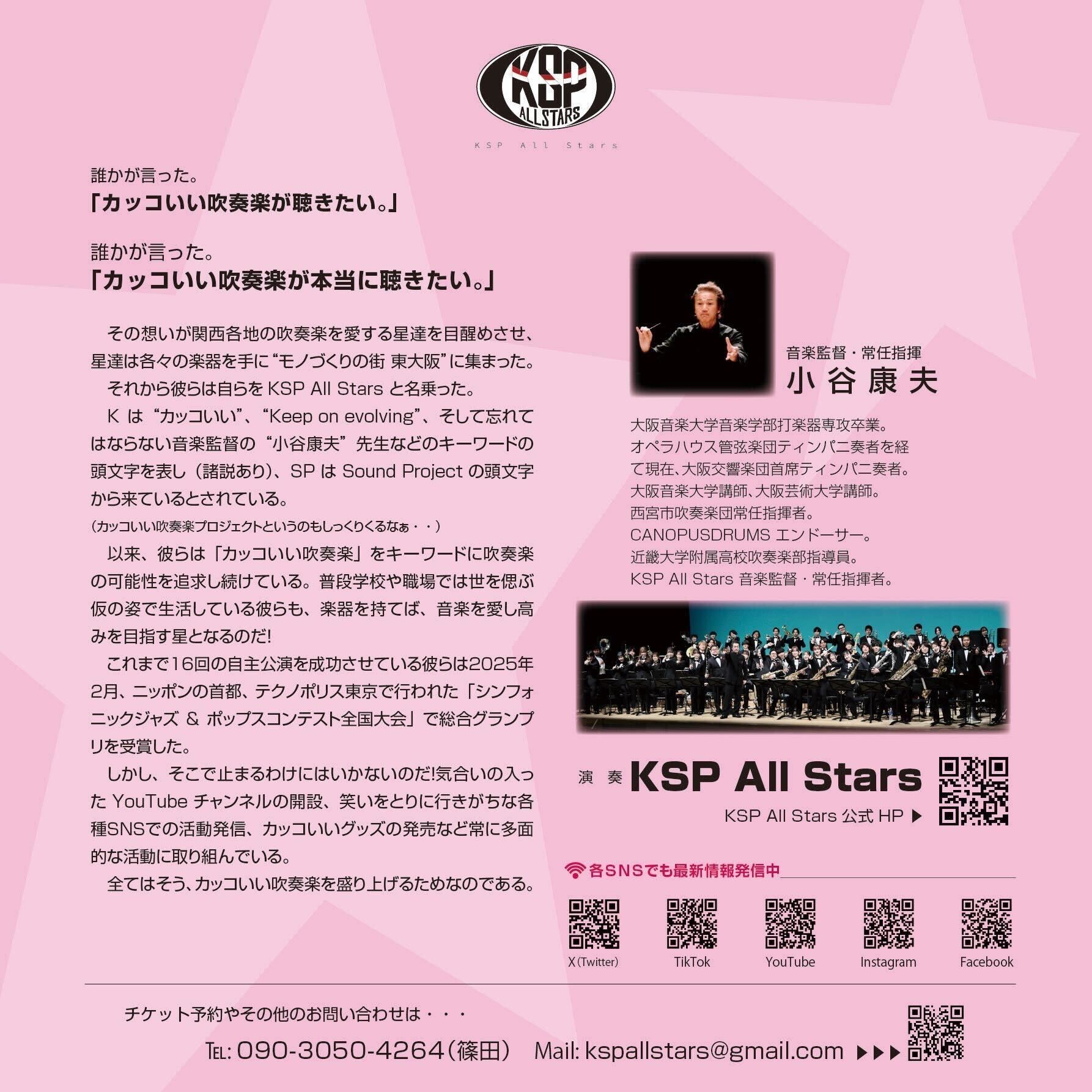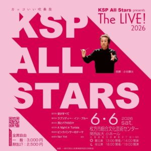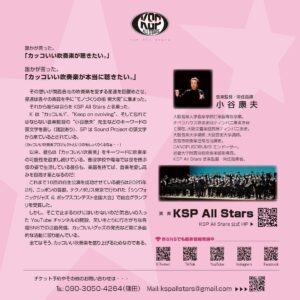 | 内容 | 昼夜2公演の単独ライブです。第14回 Symphonic Jazz & Pops Contest 全国大会で金賞•グランプリを受賞した「Not Yet」も演奏します!KSP All Starsの「カッコいい吹奏楽」をお楽しみください。 |