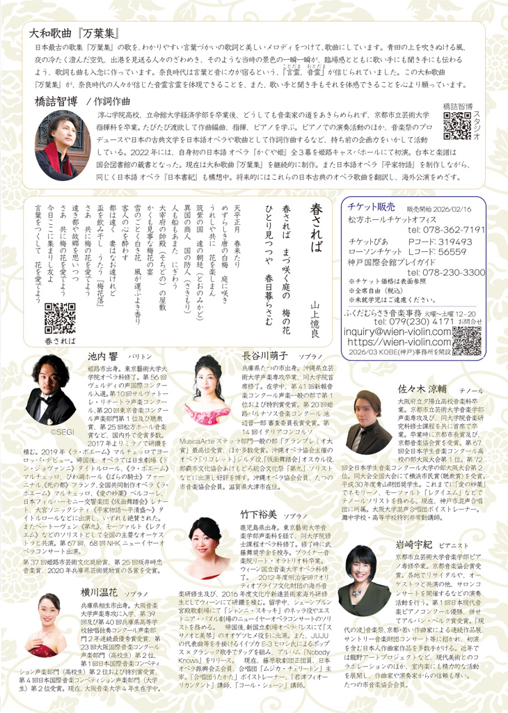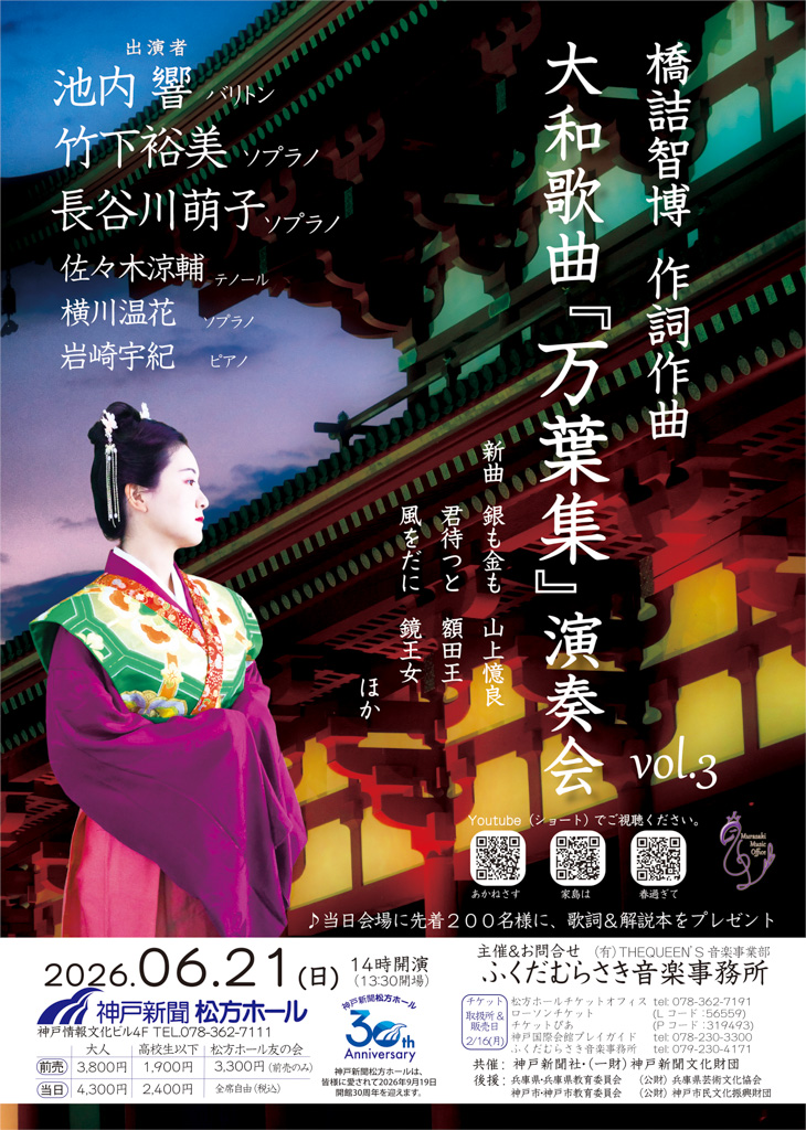 内容日本最古の歌集『万葉集』の歌に、橋詰智博がわかりやすい言葉使いの歌詞と美しいメロディをつけて歌曲にしました。新曲・銀も金も 山上憶良・君待つと 額田王  など出演者池内響(Br)、竹下裕美(Sop)、長谷川萌子(Sop)