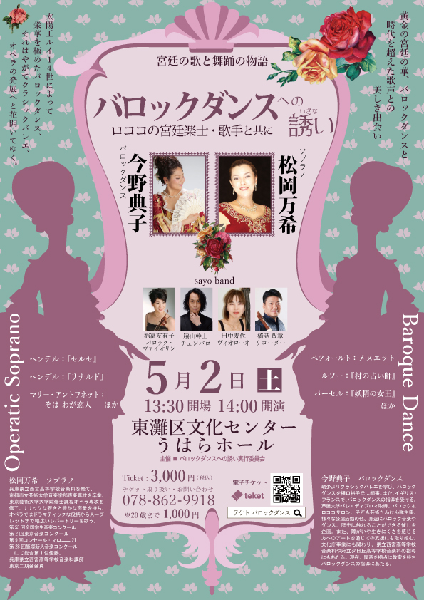 | 内容 | 王侯貴族の宮廷文化の中で育まれてきた古典宮廷舞踊と音楽を紹介するコンサート。マリーアントワネット作曲の小歌曲にのせて踊る宮廷ダンス。観る人を宮廷の客人となったような没入感に誘います。 |
