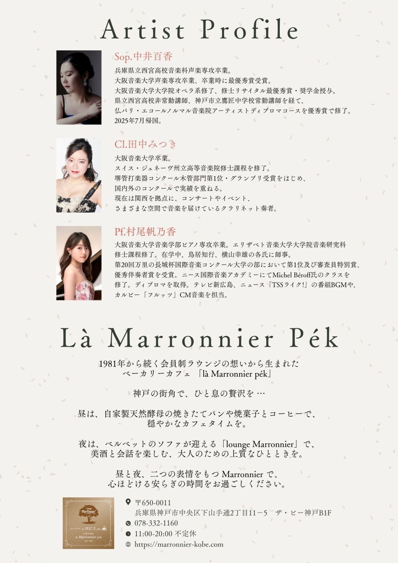 神戸・ラ マロニエ ペクにて、ソプラノ・クラリネット・ピアノによる春のクラシックコンサート。