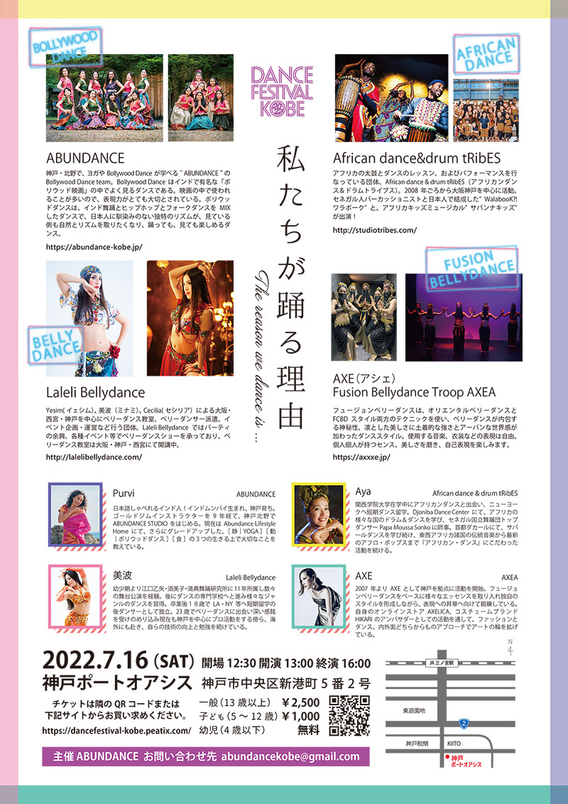 | 内容 | 関西を代表する、さまざまなチームが神戸に集結☆インド映画で知られる、ボリウッドダンスグっとっくるビートのアフリカンダンスエキゾチックなベリーダンス超クールなフィージョンベリーダンス!ぜひ「私たちが踊る理由」を観に来てください! |
