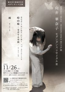| 内容 | 神戸を拠点に活動する藤田佳代舞踊研究所主催のモダンダンス公演。向井華奈子作舞の新作「時の庭-交差する空間」は真言宗僧侶による声明の響きでモダンダンスを踊る。藤田佳代作舞「雨」は舞台美術に書家和田彩の書作品を使用する。二作品を発表する。 |