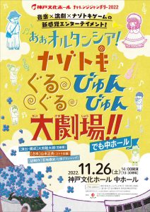 | 内容 | 神戸文化ホールチャレンジジャンボリー2022 ああオルタンシア!ナゾトキぐるぐるびゅんびゅん大劇場!!(でも中ホール) 演劇と音楽と謎解きゲーム がミックスされた新感覚エンターテイメント! |