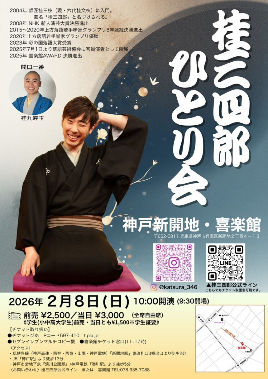 | 内容 | 神戸市垂水区出身 落語家・桂三四郎神戸新開地・喜楽館にて「桂三四郎ひとり会」を開催します。関西で初の独演会です。落語初心者の方にもおすすめの公演です。朝から笑って、素敵な一日のスタートにしませんか。皆様のご来場を心よりお待ちしております。 |