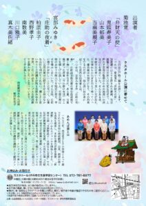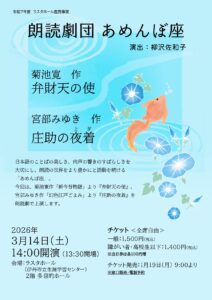 内容〚美しい日本語を大事にする朗読劇団 あめんぼ座の朗読劇へようこそ〛今回は、菊池寛作「新今昔物語」より『弁財天の使』、宮部みゆき作「幻色江戸ごよみ」より『庄助の夜着』の2作品を朗読劇で上演します。