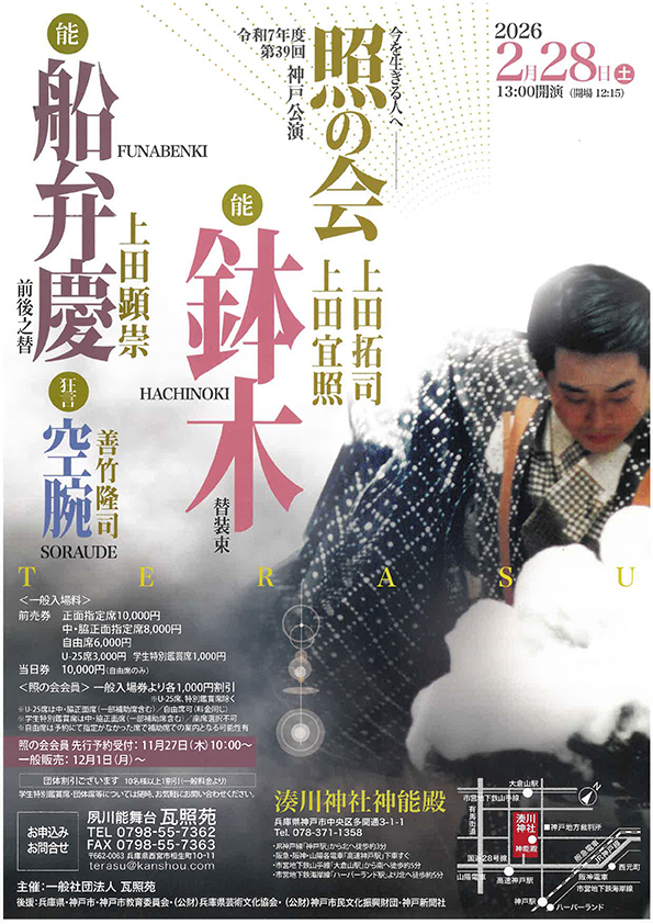 | 内容 | 兵庫県在住の能楽師を中心とした能楽公演。観世流能「鉢木 替装束」、大蔵流狂言「空腕」、観世流能「船弁慶 前後之替」を上演いたします。 |