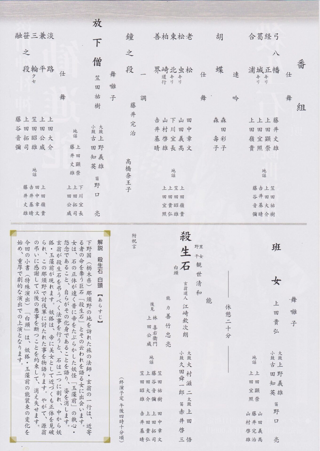 | 内容 | 能 『殺生石』 観世清和舞囃子 『班女』 、『放下僧』 仕舞、連吟、一調がございます。 |