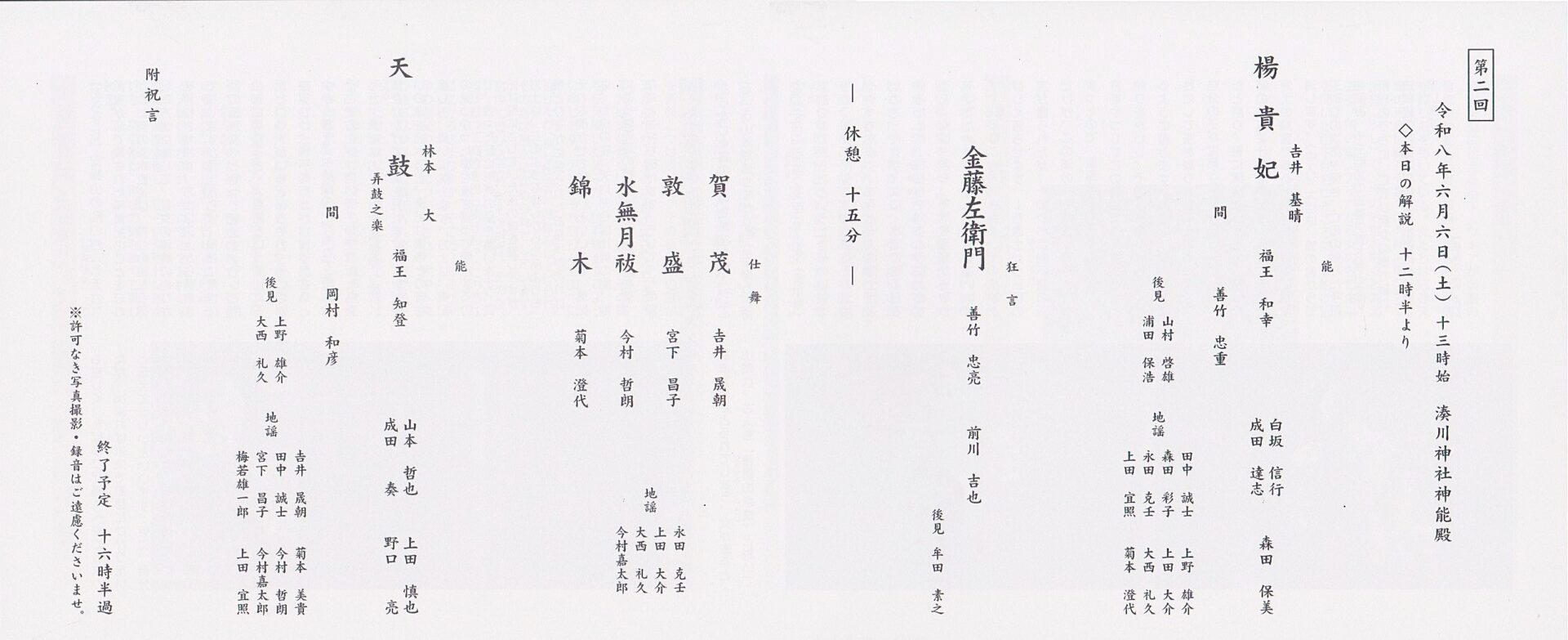 | 内容 | 能 『楊貴妃』 『天鼓』 狂言 『金藤左衛門』 仕舞もございます。 |