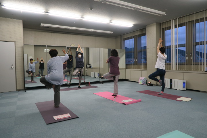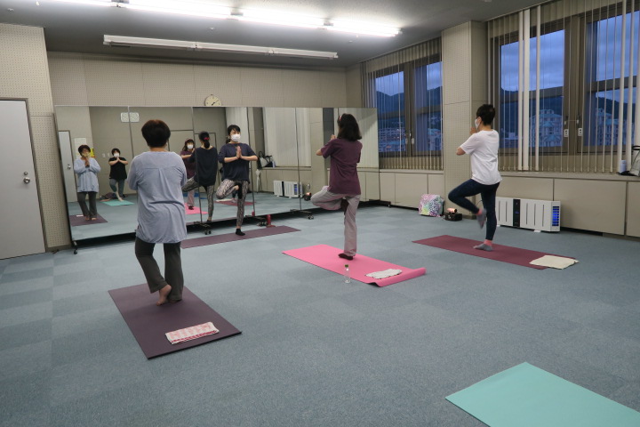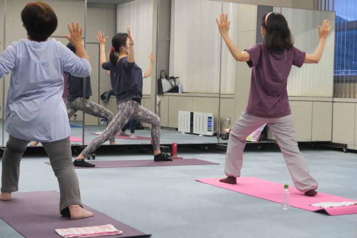 体の各関節(首、肩関節、膝関節、股関節等)を修正する動きで体を整える。その後、毎週変わるヨガのポーズと呼吸法を行います。