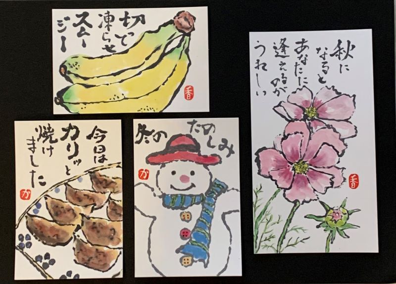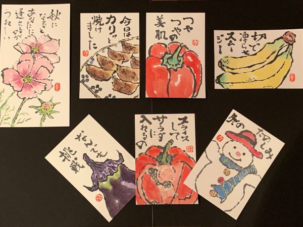 絵手紙は心にポッと明かりが灯ったようなあたたかい気持ちになれます。四季を感じながら自分らしい絵手紙を描いてみませんか。『ヘタでいい ヘタがいい』が合言葉。初めての方も楽しく始められます。お花や野菜、雑貨や大好きな食べ物など何でもモチーフになるのも絵手紙のおもしろい所です。自分らしく言葉を添えて心を元気にしましょう。