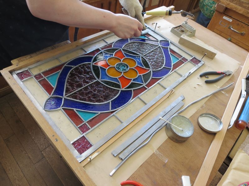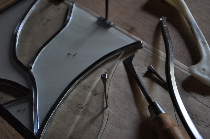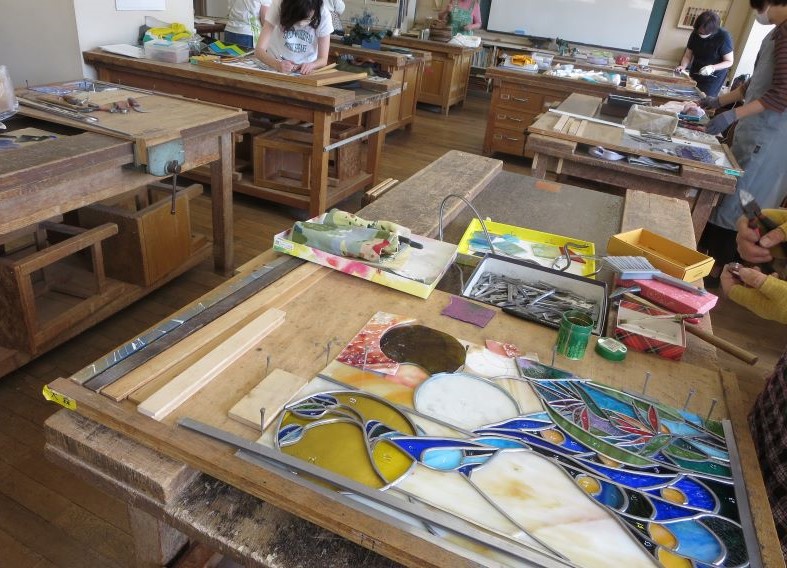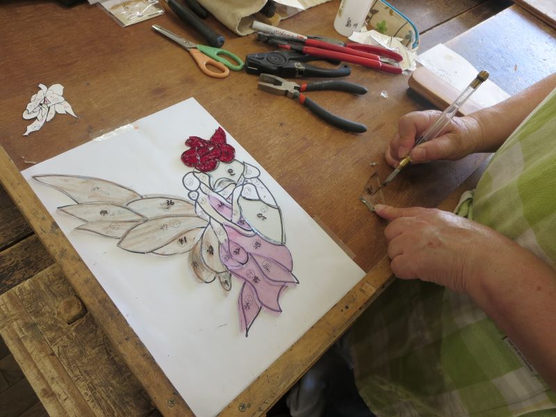 お家の窓や扉に飾れるような本格的なステンドグラスのパネル作品をデザインから考え制作していきます。初めてでも大丈夫です!①デザインを決めて、3枚コピーをとる。②型紙を切り、ガラスを型紙通りにカットする。③鉛線をはめていく。④ハンダ付けをする。⑤パテ詰めをし、仕上げ全体を磨き完成する。