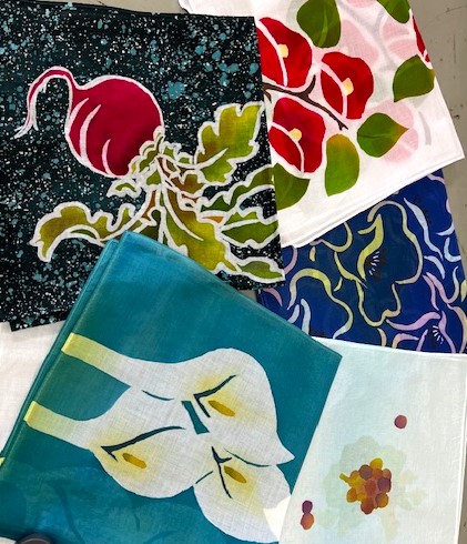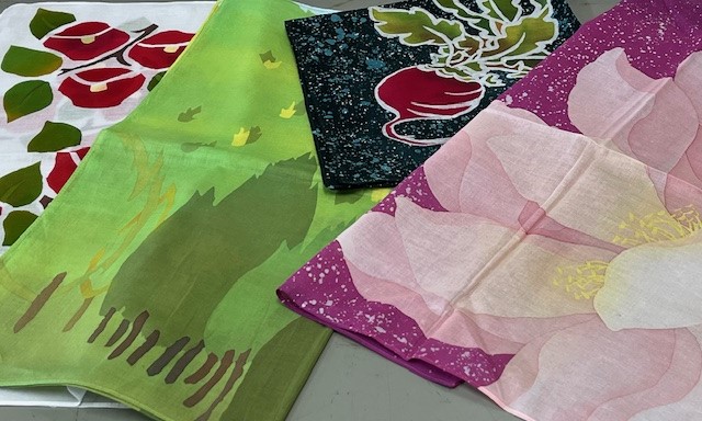 型染・ローケツ染・絞り染等いろいろな技法を指導いたします。はじめての方でもきれいな色に染めあがります。楽しく、ハンカチ・ストール等きれいに染め上がります。講師は型染が専門ですがローケツ染、草木染等にも造詣があり、行えます。専門的な事もその方に合わせて対応します。型染・ろうけつ染・しぼり染と幅広く可愛らしい小物から作りましょう