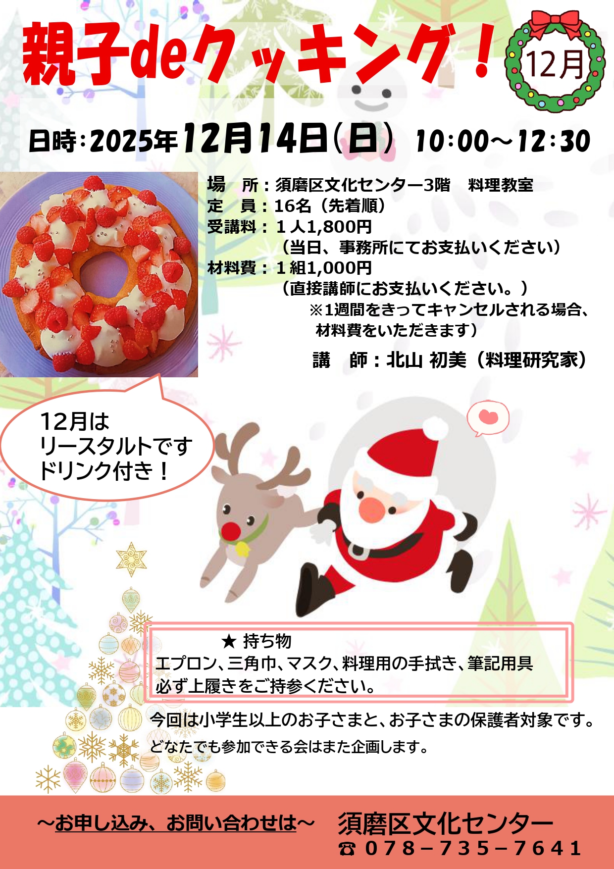 随時講座 「親子で作るXmasケーキ教室」 日程:令和7年1 …