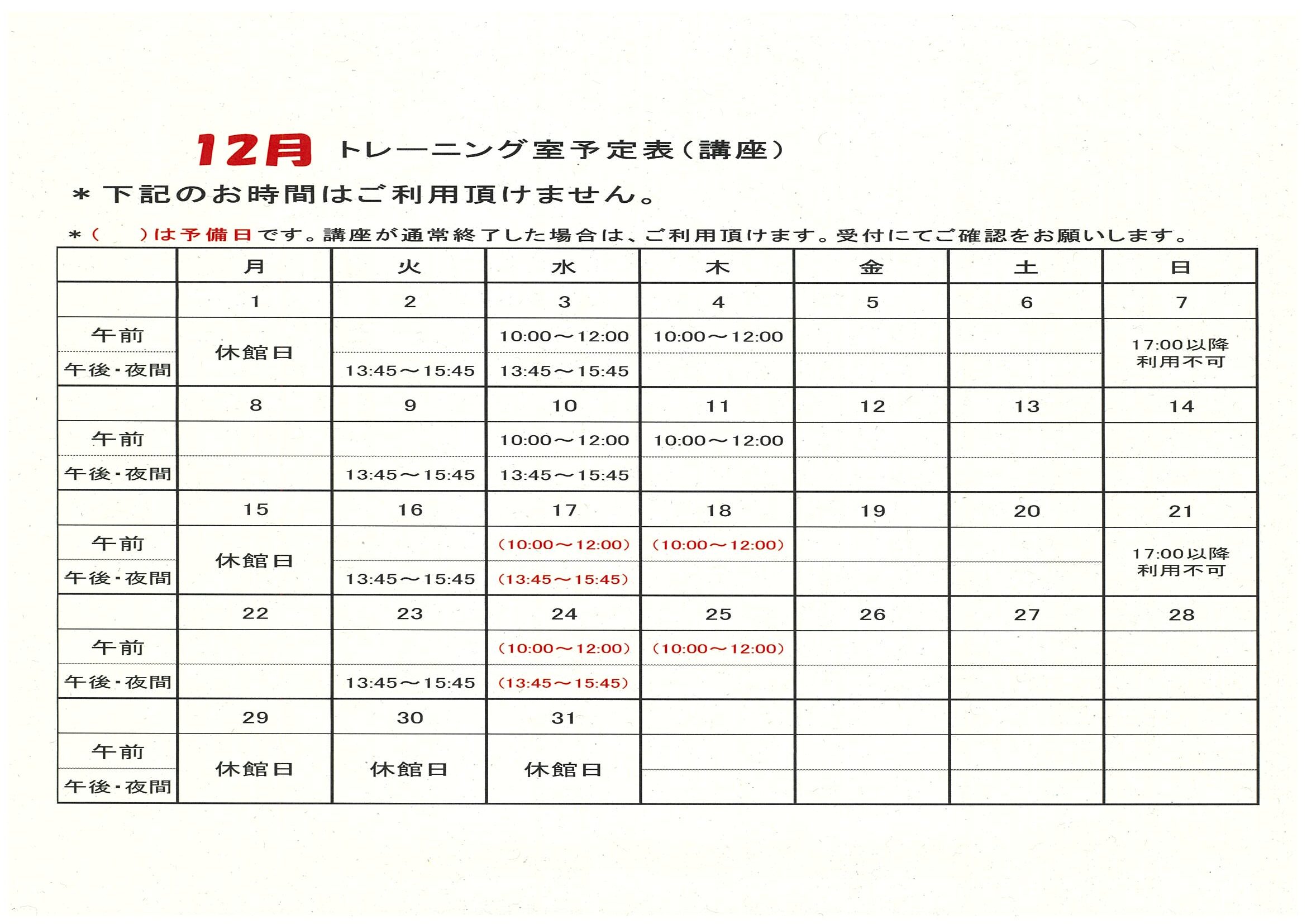 12月「トレーニング室」予定表 定例講座・同好会の時間以外は …
