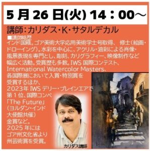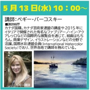 ■持ち物:水彩用具一式(ご自身のお手持ちの道具で構いません)。透明水彩絵具(色数自由)、各種筆(丸筆、平筆、など水彩用の筆なら自由。油絵の筆は硬いので適しません)、筆洗い、水彩用の紙(丈夫な紙で6号(32×41cm)以上) 。混色用パレット又は色皿(牛乳パック裏でOK!)、雑巾(筆拭き用)。ティッシュあれば便利です。※モチーフ・写真等は講師が用意します。