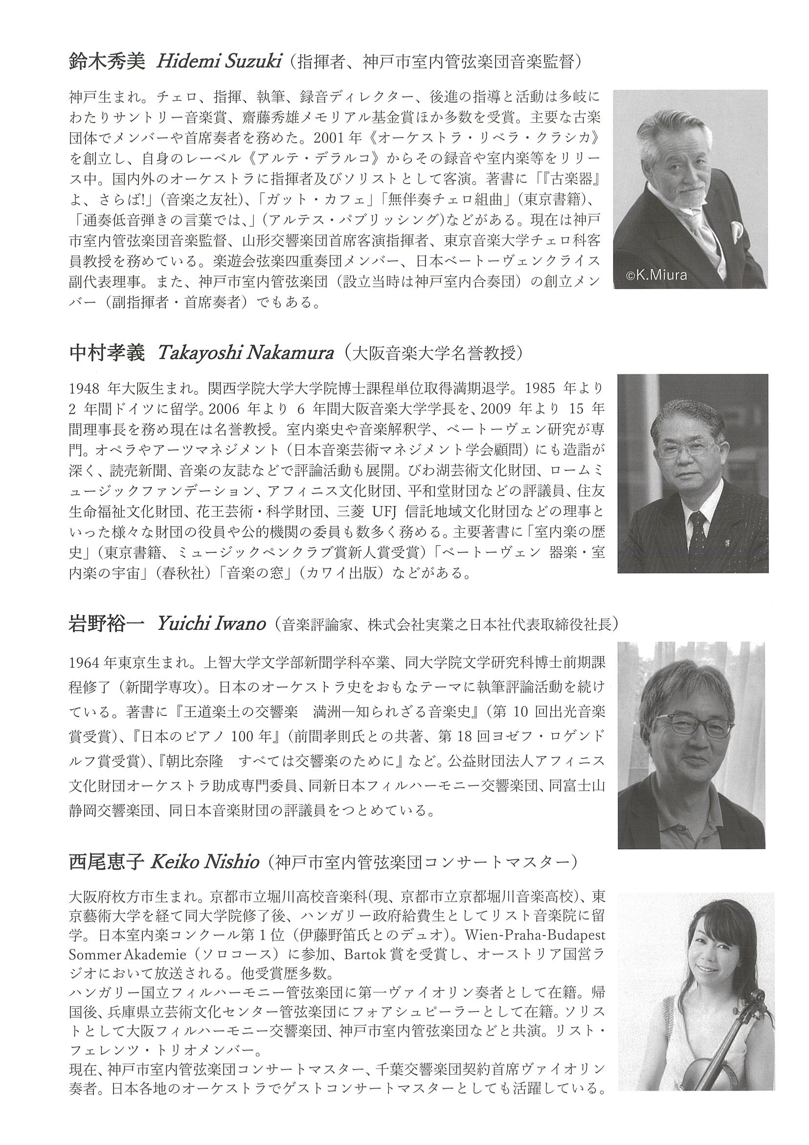 講師:① 鈴木秀美(指揮者、神戸市室内管弦楽団音楽監督) ②中村孝義(大阪音楽大学名誉教授) ③ 岩野裕一(音楽評論家、㈱実業之日本社代表取締役社長)・西尾恵子(神戸市室内管弦楽団コンサートマスター)