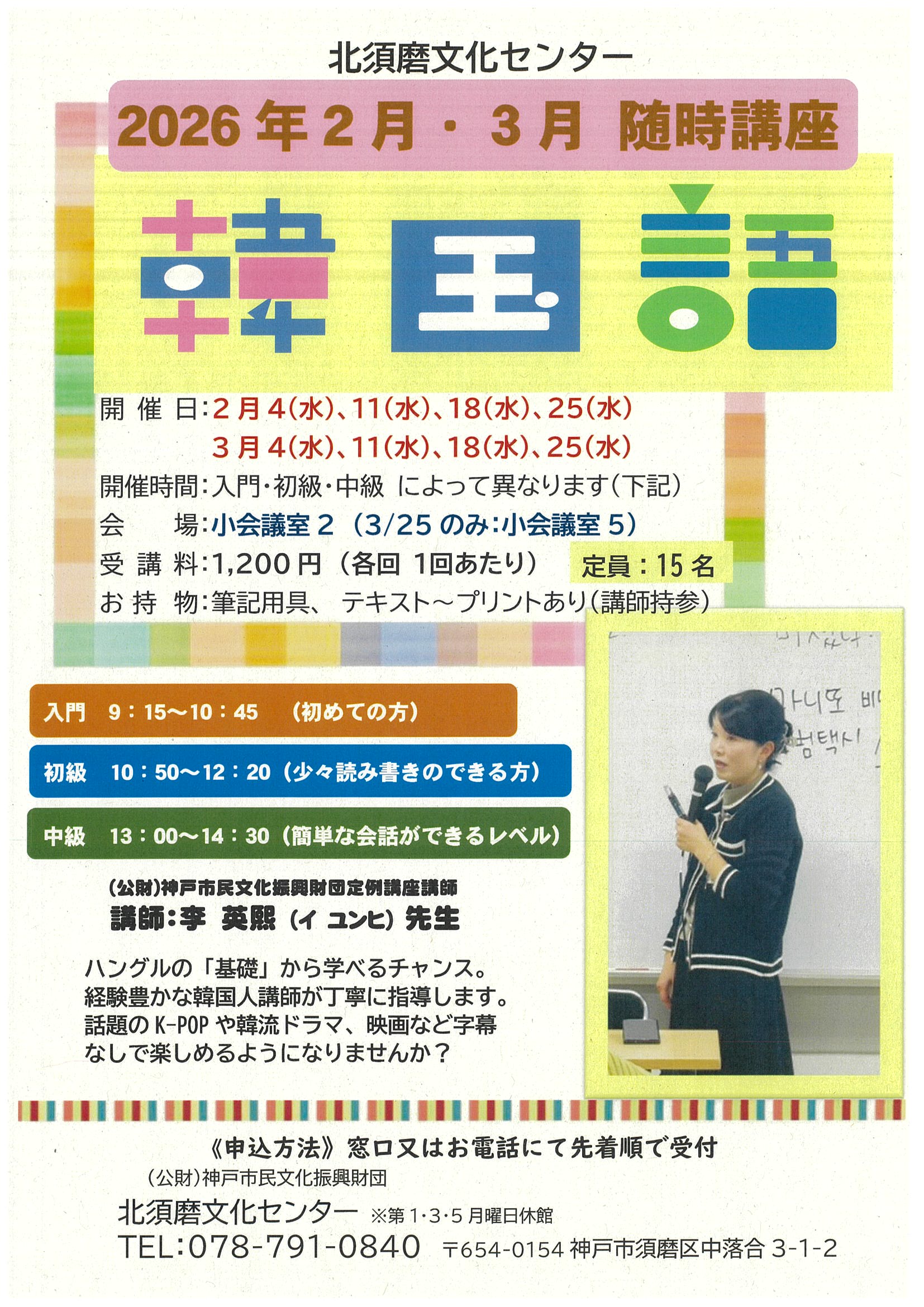 【北須磨文化センター】「韓国語」随時講座(2026年2-3月)