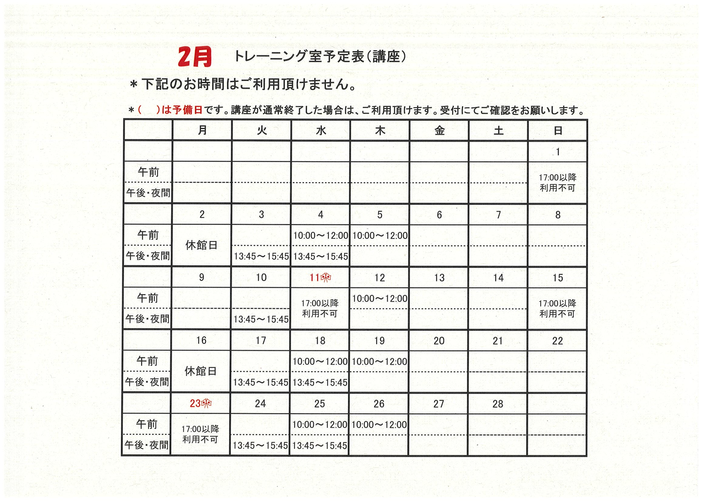 | 備考 | 最終受付は原則、「閉館時間の60分前」までです。 利用申込は1階事務所です。 講座中や団体利用中など利用できない時間帯がございますので、利用時間表をご確認ください。 なお、初めてご利用される方は、初回講習(無料)が必要です。 所要時間は30分程度です。 お電話にてご予約をお取りください。 |