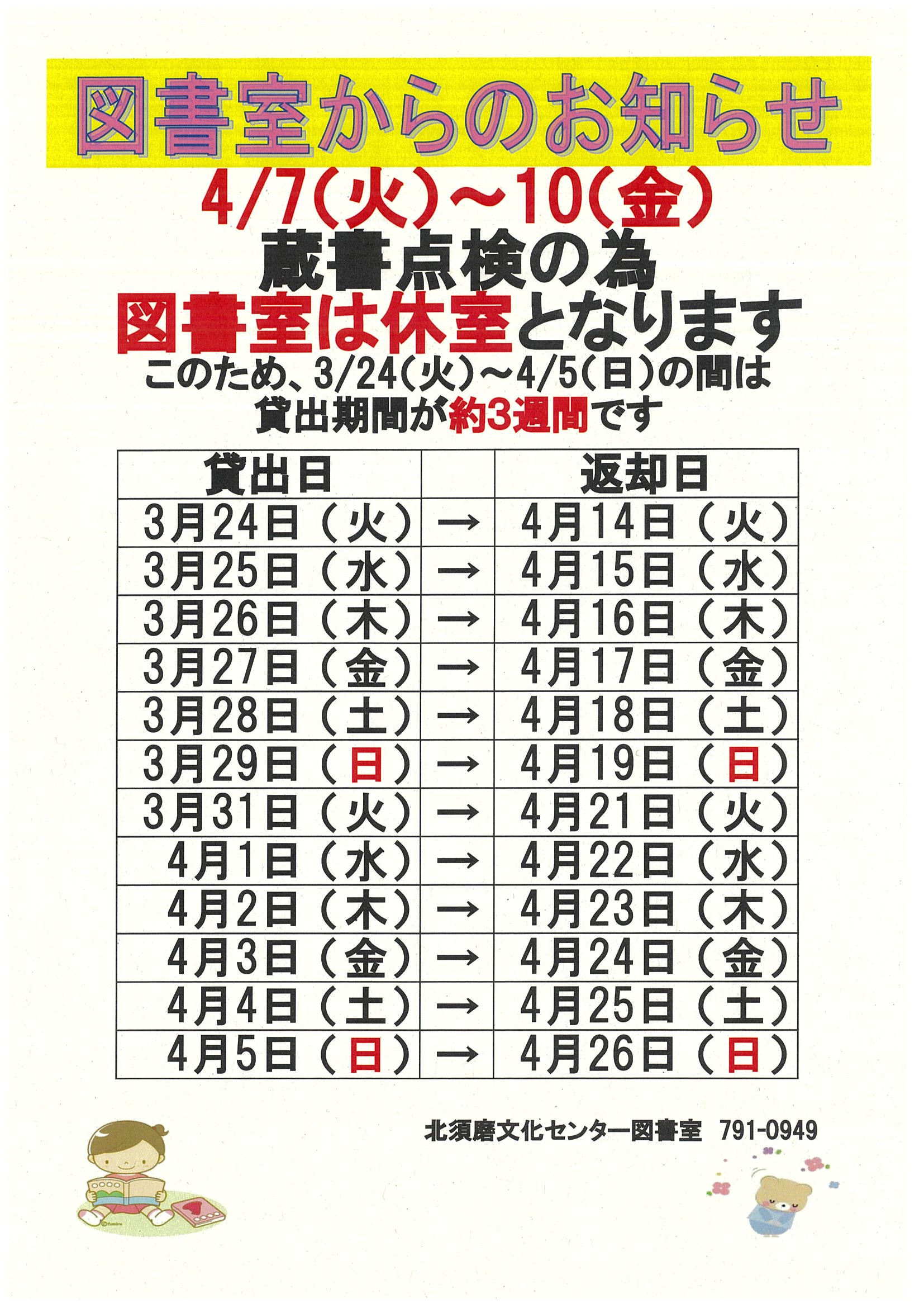 ※3月24日(火)~4月5日(日)までは、貸出期間が約3週間になります。